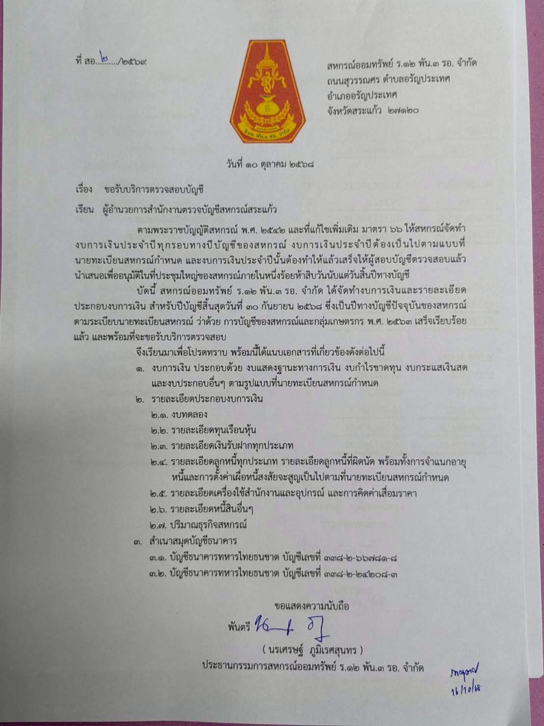 | 3 | สอ. ร.12 พัน 3 รอ. จำกัด | ออมทรัพย์ | 09 | 30 ก.ย. 68 | 1 | 10 | 1 |