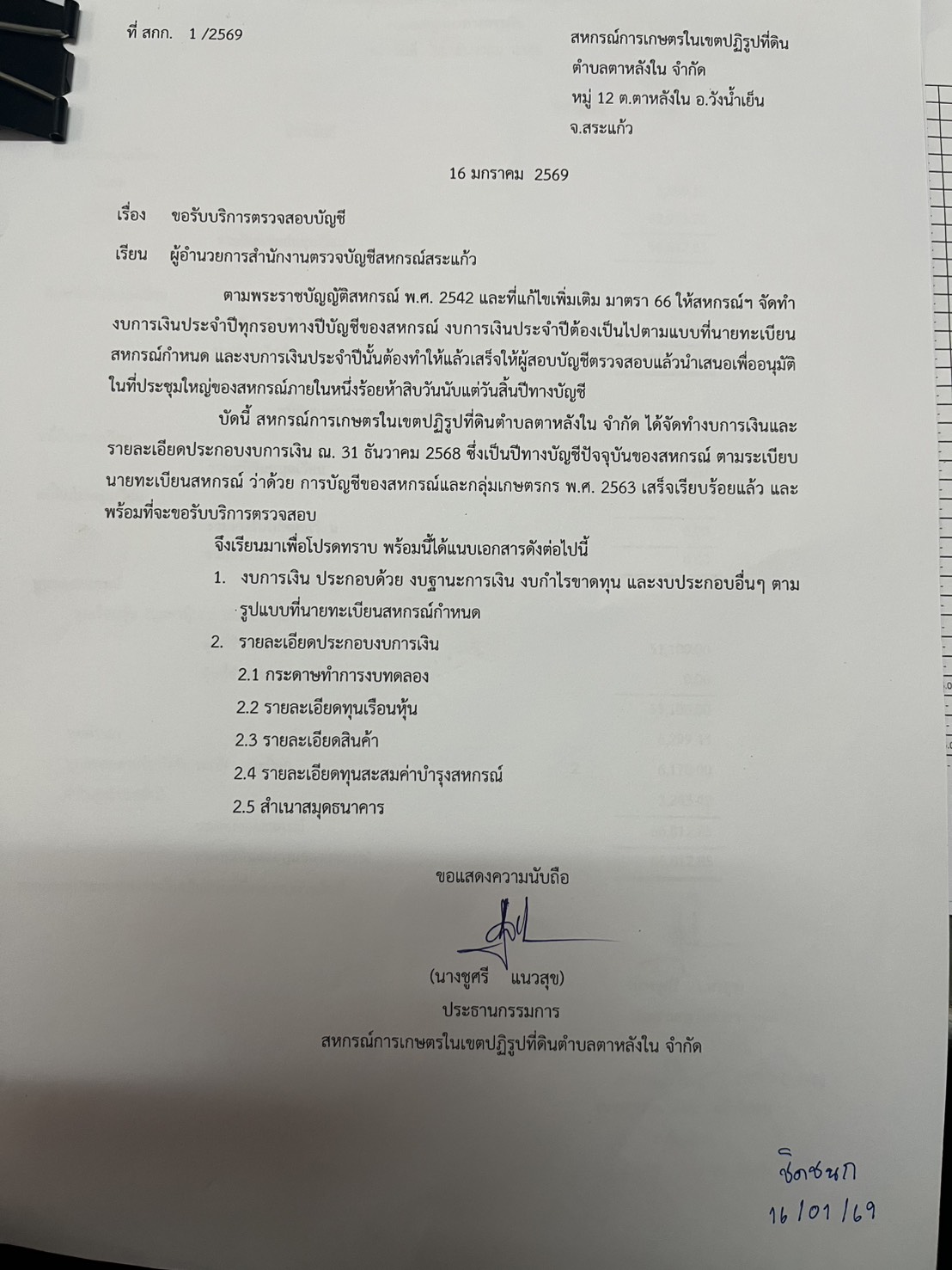 | 22 | สก.ปฏิรูปที่ดินอำเภอวังน้ำเย็น (คทช.) จำกัด | เกษตร | 12 | 31 ธ.ค. 68 | 1 | 29 | 1 | 29 ม.ค. 69 | อรญา / | ||||||||||||